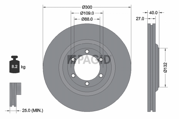 страна на монтаж: предна осброй на дупките за закрепване: 6вид на спирачния диск: вентилиранвисочина: 40mmвъншен диаметър: 300mmдебелина на спирачния диск: 27mmДиаметър на кръговата стъпка Ø: 109mmмин. дебелина: 25mmтегло: 8,6kgцентриращ диаметър: 88mm
