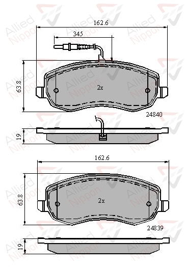 страна на монтаж: предна осWVA-номер: 24839WVA-номер: 24840дебелина: 19mmдължина: 162,6mmконтактен датчик за износване: със сензор за износванеспирачна система: TRWширина: 63,8mm