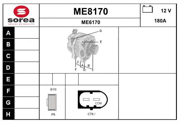 ID-изпълнение на щекера: B+COMброй на дупките за закрепване: 2брой на каналите: 6напрежение: 14волтзаряден ток на генератор: 180Апосока на въртене: въртене по посока на часовниковата стрелкаДистанция от ремъчната шайба до генератора: 42mmремъчни шайби: с шайба за пистов ремъкРемъчна шайба Ø: 50mm