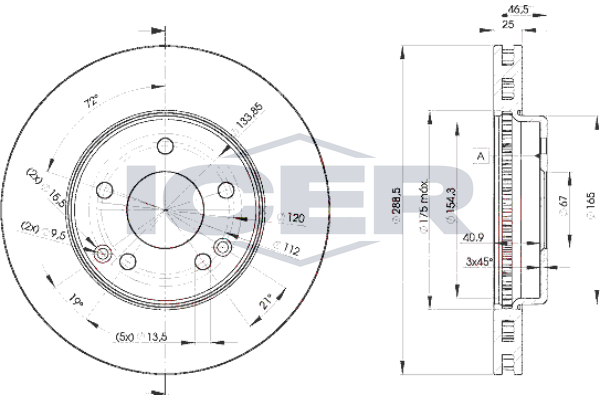 брой на дупките: 5вид на спирачния диск: вентилиранвисочина: 46,5mmвъншен диаметър: 288mmдебелина на спирачния диск: 25mmОтвор Ø: 13mmдоп. артикул/доп. инфо. 2: с винтовеДиаметър на кръговата стъпка Ø: 112mmмин. дебелина: 22,4mmстрана на монтаж: предна осцентриращ диаметър: 67mm