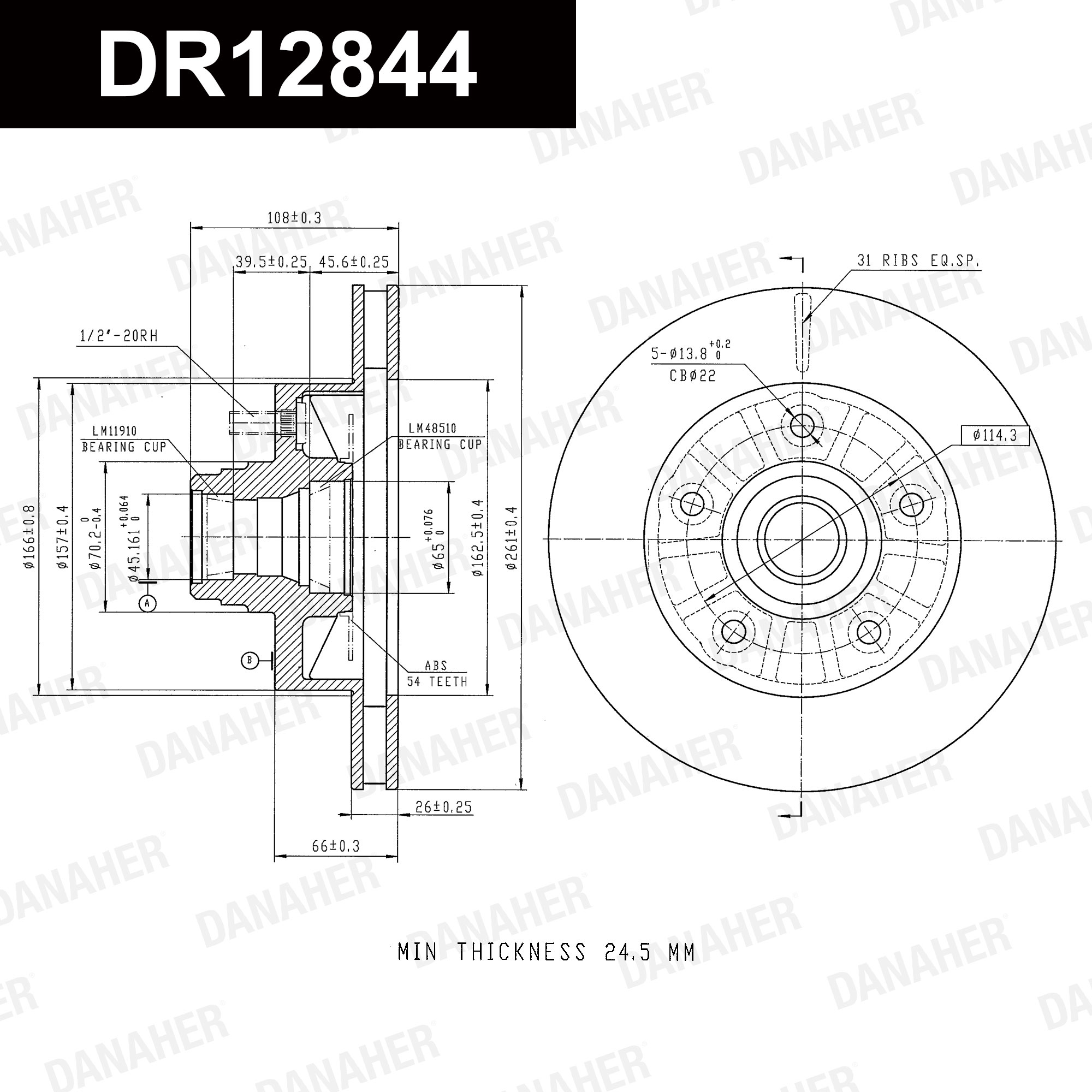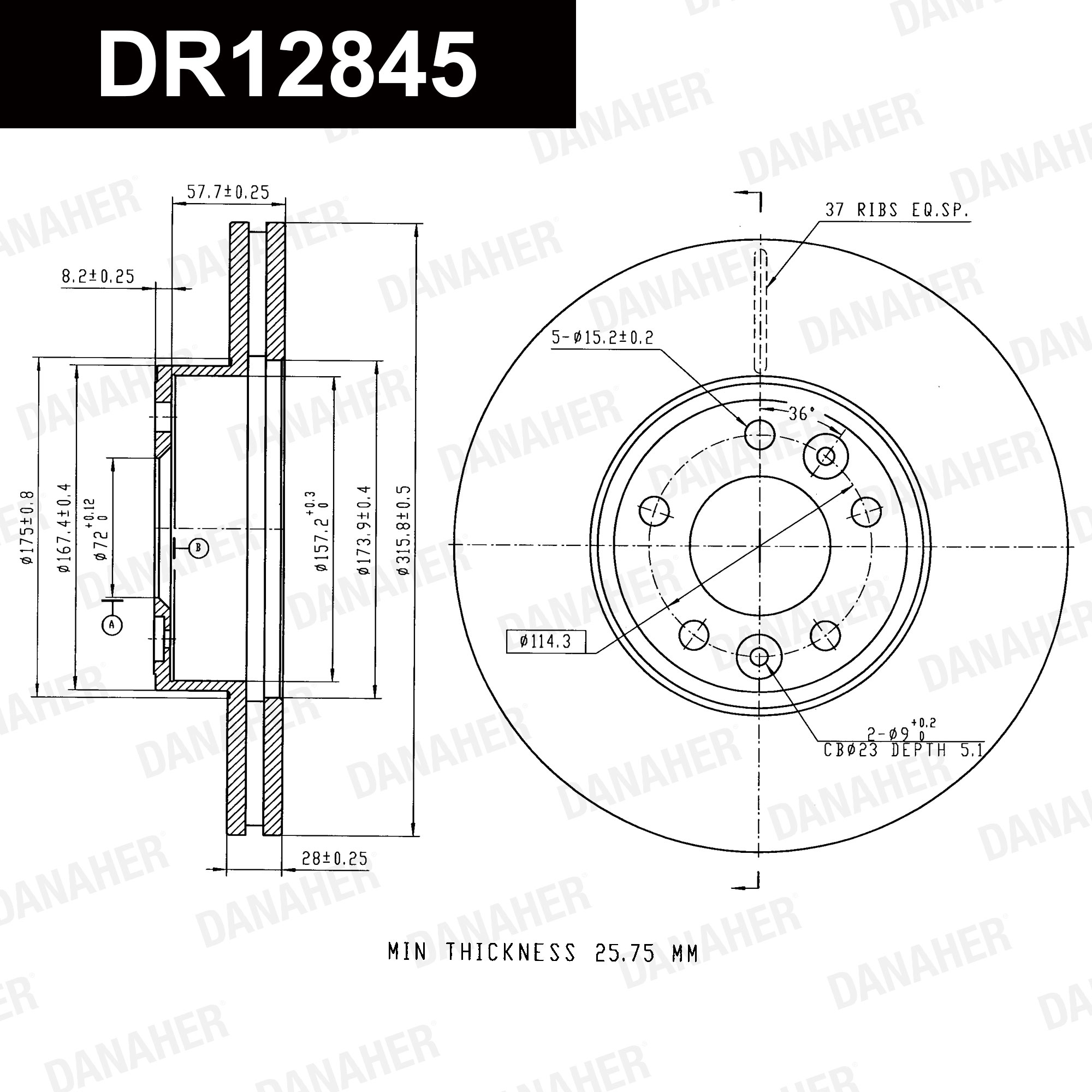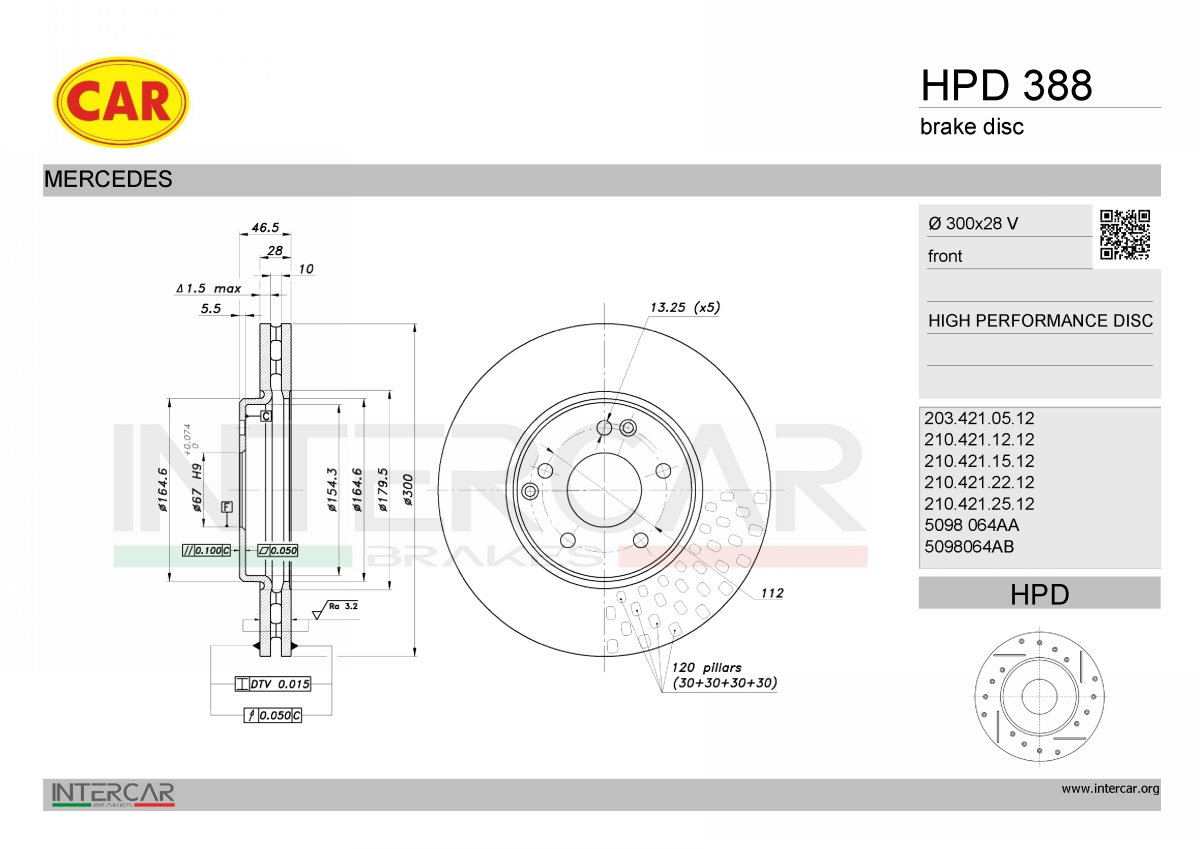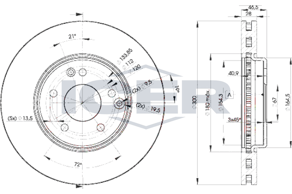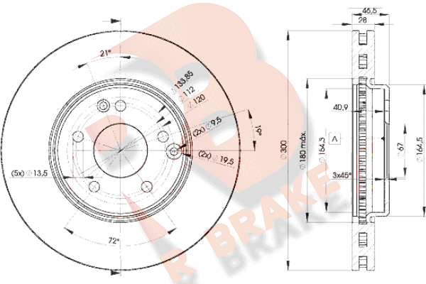страна на монтаж: предна осджанта: 5-дупкивид на спирачния диск: вентилиранвисочина: 46,5mmвъншен диаметър: 300mmдебелина на спирачния диск: 28mmГлавина Ø: 164mmДиаметър на кръговата стъпка Ø: 112mmмин. дебелина: 25,4mmповърхност: с покритиецентриращ диаметър: 67mm
