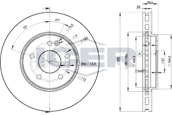 страна на монтаж: предна осброй на дупките: 5вид на спирачния диск: вентилиранвисочина: 46,5mmвъншен диаметър: 300,0mmвътрешен диаметър: 154,0mmдебелина на спирачния диск: 28,0mmОтвор Ø: 13,3mmДиаметър на кръговата стъпка Ø: 112,0mmмин. дебелина: 25,4mmпреработка: легиран/ високовъглероденцентриращ диаметър: 67,0mm