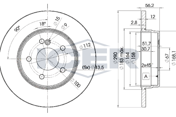 брой на дупките: 5вид на спирачния диск: вентилиранвисочина: 55,5mmвъншен диаметър: 290mmвътрешен диаметър: 164mmдебелина на спирачния диск: 10,0mmОтвор Ø: 13,3mmДиаметър на кръговата стъпка Ø: 112mmмин. дебелина: 8,3mmповърхност: с покритиестрана на монтаж: задна осцентриращ диаметър: 67mm