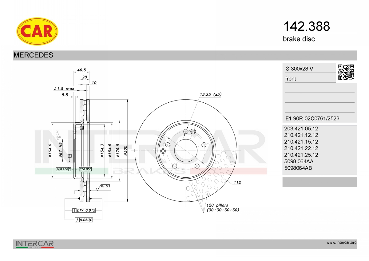 джанта: 5-дупкивид на спирачния диск: вентилиранвисочина: 46,5mmВисочина главина спирачен диск: 18,4mmвъншен диаметър: 300mmдебелина на спирачния диск: 28mmДиаметър на кръговата стъпка Ø: 112mmмин. дебелина: 25,4mmстрана на монтаж: предна осцентриращ диаметър: 67mm