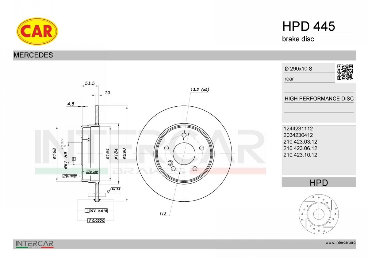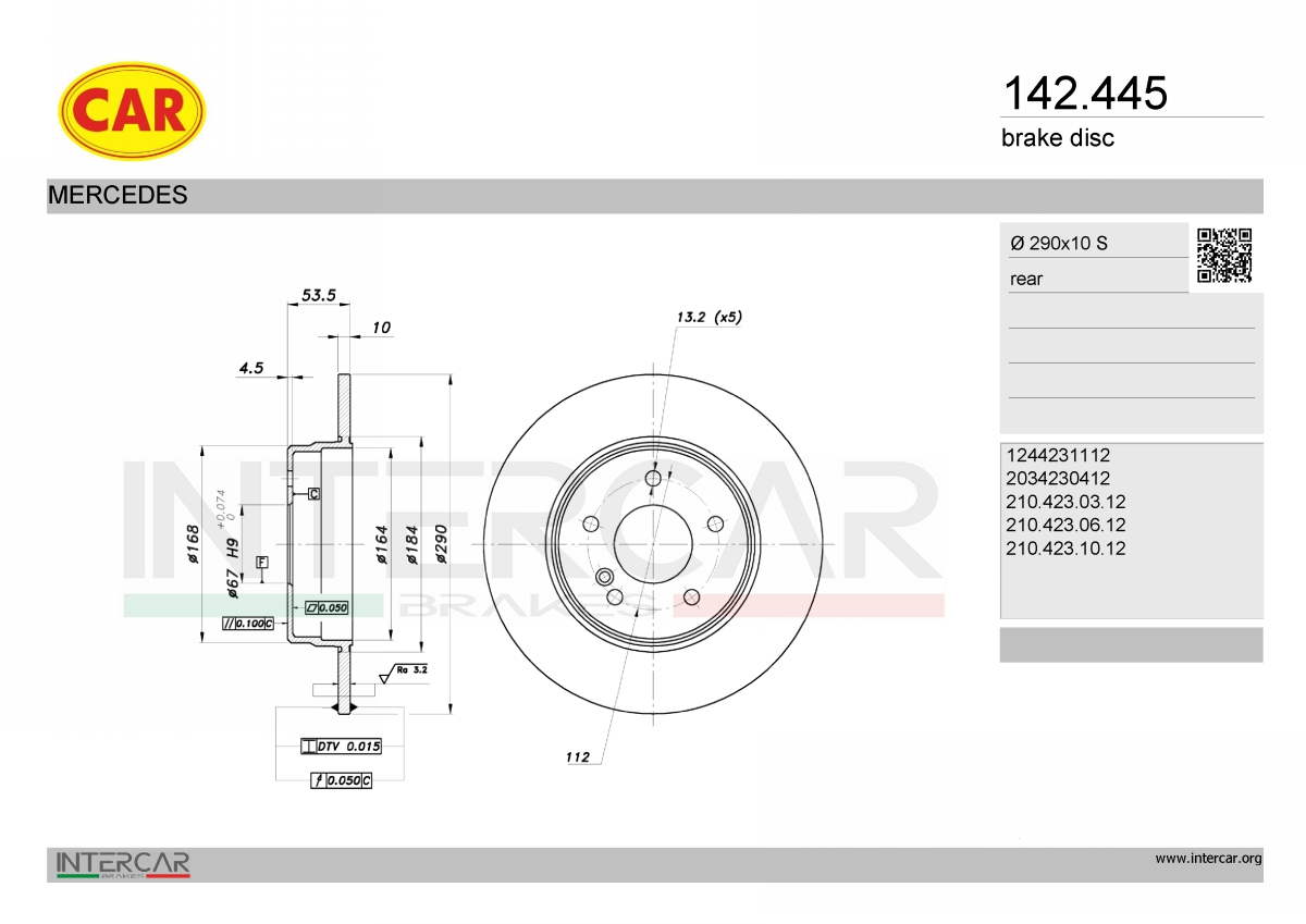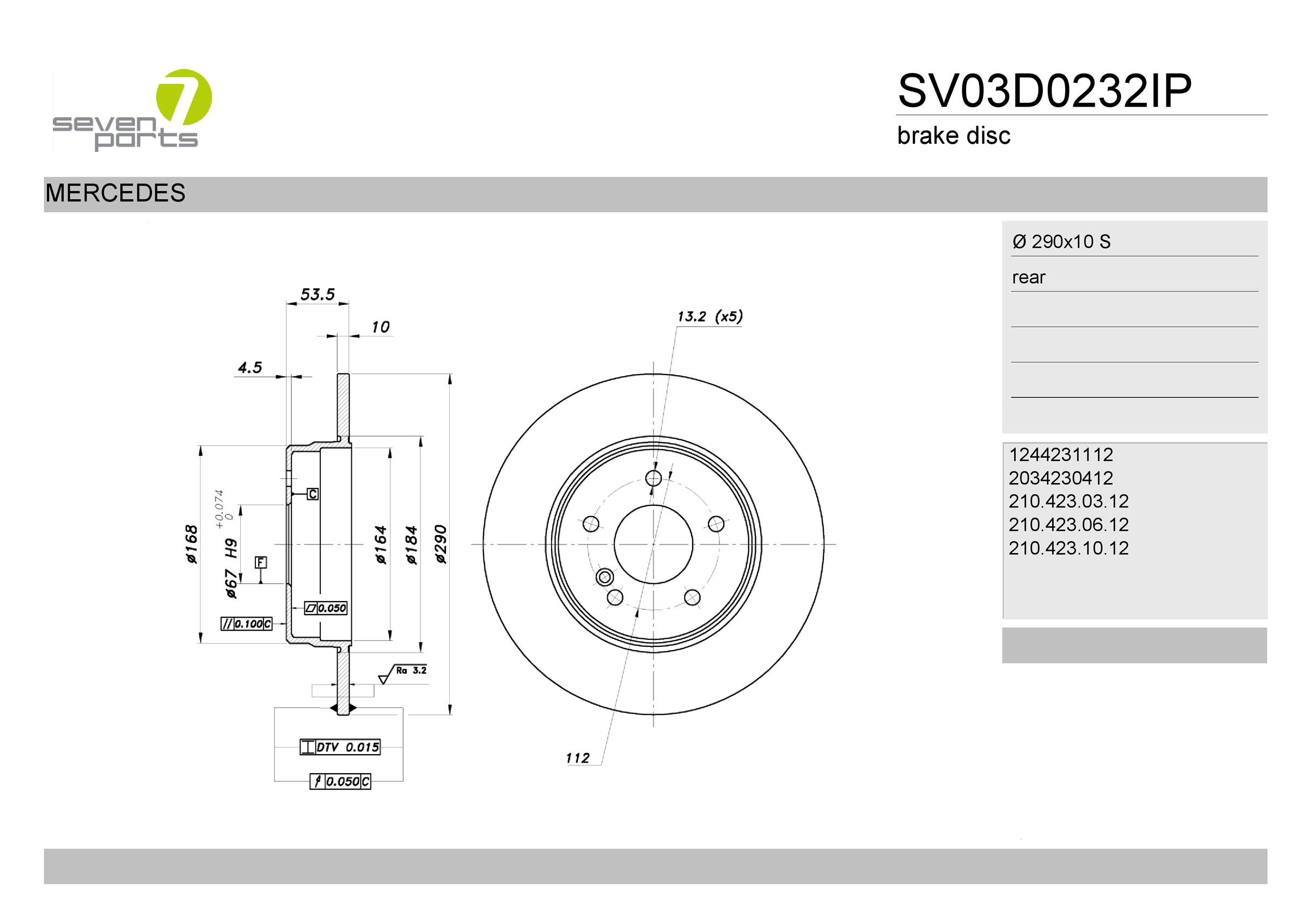 джанта: 5-дупкивид на спирачния диск: плътенвисочина 1: 53,3mmвисочина 2: 55,3mmвъншен диаметър: 290mmдебелина на спирачния диск: 10mmГлавина Ø: 168mmДиаметър на кръговата стъпка Ø: 112mmповърхност: с покритиестрана на монтаж: задна осцентриращ диаметър: 67mm