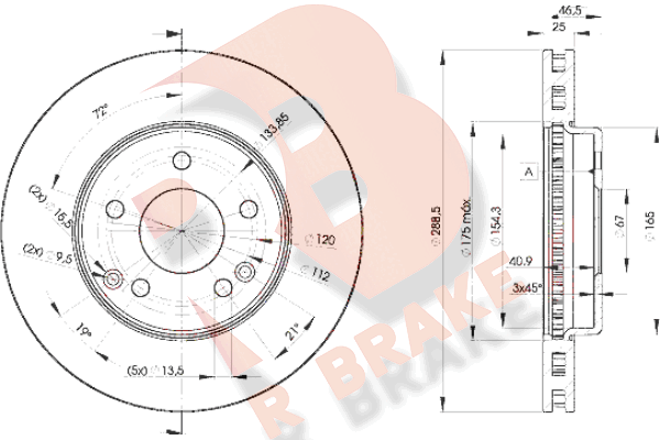 брой на дупките: 5вид на спирачния диск: вентилиранвисочина: 46,7mmвъншен диаметър: 288mmдебелина на спирачния диск: 25mmОтвор Ø до: 13,3mmДиаметър на кръговата стъпка Ø: 112mmмин. дебелина: 22,4mmповърхност: с покритиестрана на монтаж: предна остегло: 6,56725kgцентриращ диаметър: 67mm