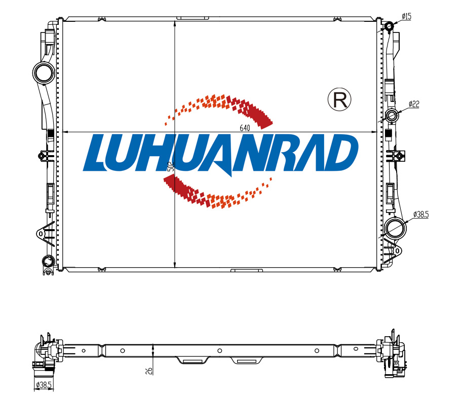 Входящ отвор Ø: 38,5mmдълбочина на мрежа: 26mmдължина на мрежа: 640mmизпълнение на охладител: запоени охлацдащи ламелиИзходящ отвор Ø: 38,5mmматериал на ламелите на радиатора: алуминийматериал на резервоар (охладител): пластмасатип на трансмисията: автоматична трансмисия с възможност за ръзно превключванеширина на мрежа: 438mm