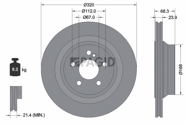 страна на монтаж: задна осджанта: 5-дупкивид на спирачния диск: вентилиранвисочина: 68,2mmвъншен диаметър: 320mmдебелина на спирачния диск: 24mmГлавина Ø: 168mmДиаметър на кръговата стъпка Ø: 112mmмин. дебелина: 21,4mmповърхност: с покритиетегло: 8,34kgцентриращ диаметър: 67mm