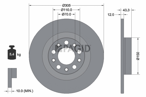 брой на дупките: 10вид на спирачния диск: плътенвисочина: 43,3mmвъншен диаметър: 305mmдебелина на спирачния диск: 12mmдебелина от: 10mmДиаметър на кръговата стъпка Ø: 110mmстрана на монтаж: задна остегло: 5,38kgцентриращ диаметър: 70mm