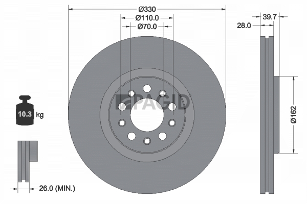 страна на монтаж: предна осджанта: 5-дупкивид на спирачния диск: вентилиранвисочина: 39,7mmвъншен диаметър: 330mmдебелина на спирачния диск: 28mmГлавина Ø: 162mmДиаметър на кръговата стъпка Ø: 110mmматериал: чугунмин. дебелина: 26mmповърхност: с покритиетегло: 10,42kgцентриращ диаметър: 70mm