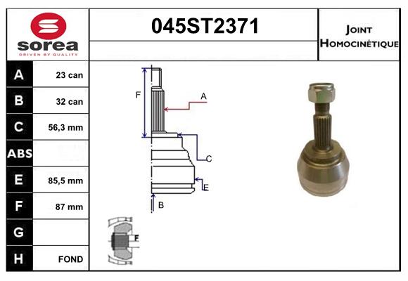 страна на монтаж: от страната на колелотоброй на зъбите на ABS-пръстен: 44вид на шарнира: сферично каре (за предаване на постоянно движение)външен диаметър: 87mmвъншни зъби от страна на колелото: 23вътрешни зъби от страната на колелото: 25диам. на гарн.: 56mm