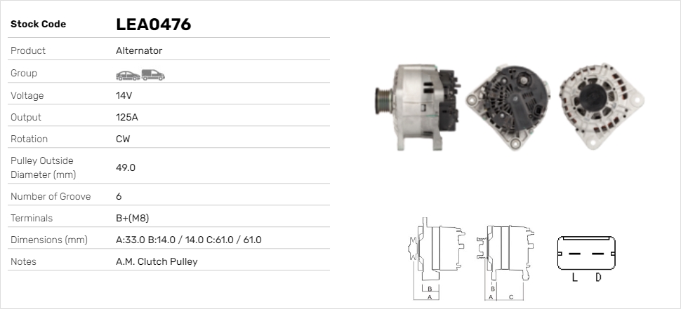 ID-изпълнение на щекера: CPA0156брой на ребрата: 6гаранция: 2 години гаранциянапрежение: 12волтзаряден ток на генератор: 125Апосока на въртене: въртене по посока на часовниковата стрелкаремъчни шайби: с ремъчна шайба със свободен ходРемъчна шайба Ø: 49mmтегло: 6,30kg