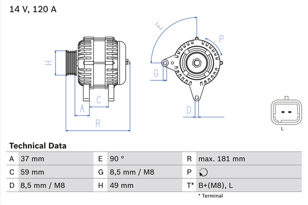 брой на ребрата: 6вид на закрепването: Триточково окачваненапрежение: 14волтзаряден ток на генератор: 120Аклема: B+ / Lконтакт/клема: без връзка за оборотомерположение/градус: L/R 0°посока на въртене: въртене по посока на часовниковата стрелкаремъчни шайби: с ремъчна шайбаремъчни шайби: с шайба за пистов ремъкРемъчна шайба Ø: 55mmтегло: 5,77kg