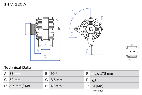 ID-изпълнение на щекера: 72брой на каналите: 6вид на закрепването: двойно завъртащо рамодължина: 178mmнапрежение: 14волтзаряден ток на генератор: 120Аизпълнение на генератора: без вакуумпомпаклема: B+(M8)посока на въртене: въртене по посока на часовниковата стрелкапрепоръчани ремонти: Задвижващ ремък/пистов ремъкДистанция от ремъчната шайба до генератора: 33mmремъчни шайби: с ремъчна шайба със свободен ходРемъчна шайба Ø: 49mm