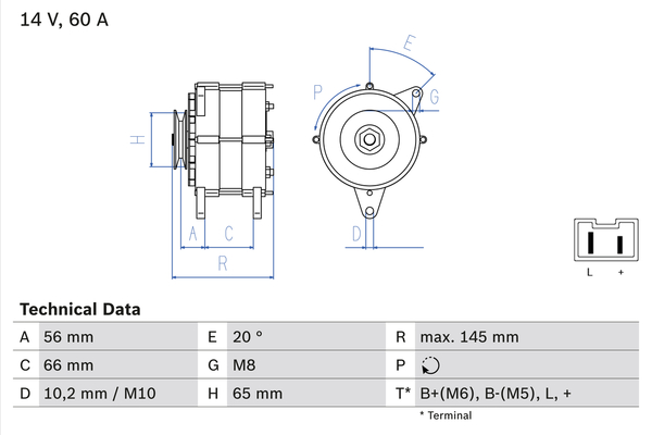 ID-изпълнение на щекера: L / +Rброй на ребрата: 3напрежение: 14волтзаряден ток на генератор: 90Аизпълнение на електрическата мрежа: за автомобили с 12V електросистемаклема: B- M5клема: B+ M8ремъчни шайби: с шайба за пистов ремъкРемъчна шайба Ø: 64mm